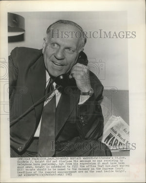 San Francisco CA Lt Governor Goodwin J Knight did not disclose the message he was receiving by phone here yesterday but from expression it must have been good news Knight is scheduled to fill the office that Gov Earl Warren will vacate should he be named to the vacancy on the Supreme Court Headlines of rumored announcement are on the seat beside Knight