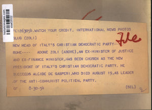 Adone Zoli, ex-minister of justice and ex-finance minister, has been chosen as the new President of Italy's Christian Democratic Party. He succeeds Alcide De Gasperi, who died August 19, as Leader of the anti-communist political party.