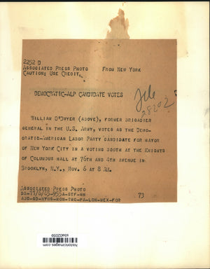 William O' Dwyer, former Brigadier General in the U.S. Army, votes as the Democratic-American Labor Party Candidate for Mayor of NYC in a voting booth at the Knights of Columbus Hall.