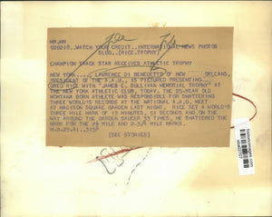NY Lawrence Di Benedetto of New orleaans president of AAU presenting George Rice with James E Sullivan memorial trophy at NY Athletic Club today The 25 year old Montana born athlete was responsible for shattering world records at National AAU meet at Madison Square Garden last night Rice set world record for mile mark of 13 minutes51 seconds and on the way around the Garden saucer 33 times He shattered the mark for 2 1/2 mile and 2 3/4 mile marks