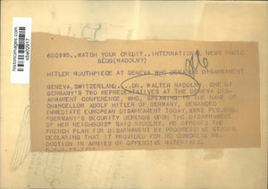 Geneva Switzerland Dr Walter Nadolny one of Germany's two reps at the Geneva disarmament conference who speaking in the name of Chancellor Adolf Hitler of Germany demanded immediate European disarmament today Feb 2nd Germany's security depends upon the disarmament of her neighbors said Nadilny He opposed the French plan for disarmameny by progressive stages declaring that it provoded no concrete reduction in armies or offensive materials