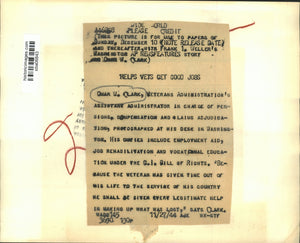 Omar W. Clark, Veteran's Administration's Assistant Administrator in charge of pensions, compensation and claims adjudication, shown at his desk in WA. His duties include employment aid, job rehab and vocational education under the GI Rill of Rights. "Because the veteran has given time out of his life to the service of his country, he shall be given every legitimate help in making up what was last," says Clark.