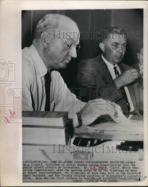 Homer Bass, testifies in Austin Monday during investigation into the public school affairs of Brownsboro. Dr. J.W. Edgar (left), State education Commissioner, said the haring would be on the dismissal of Bass as School Superintendent,the dismissal of more than half of the district teachers and the closely related question of the Brownsboro's accreditation. Bass was the first witness to testify.