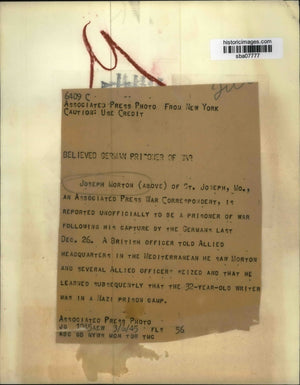 Joseph Morton of St. Joseph Mo., an Associated Press War Correspondent, is reported unofficially to be a prisoner of war following his capture by the Germans last December 26. A British officer told Allied Headquarters in the Mediterranean he saw Morton and several Allied officers seized and that he learned subsequently that the 32 year old writer was in Nazi Prison Camp.