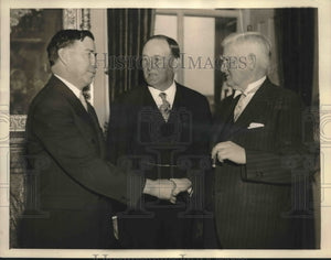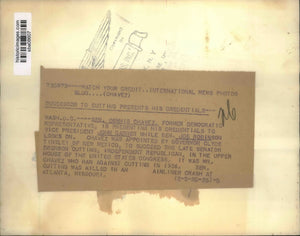 Senator Dennis Chavez, former Democratic Representative, is presenting his credentials to vice president John Garner while Senator Joe Robinson looks on. Chavez was appointed by Governor Clyde Tingley of New Mexico, to succeed the late Senator Bronson Cutting, Independent Republican, in the upper house of the United States Congress. It was Mr. Chavez who ran against Cutting in 1934. Senator Cutting was killed in an airline crash at Atlanta, Missouri.