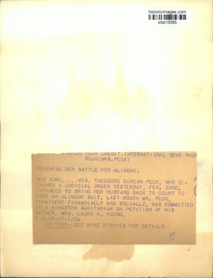 Mrs. Theodore Gordon Peck, who obtained a Judicial order yesterday, February 22nd intended to bring her husband back to court to face an alimony suit, last month Mr. Peck, prominent financially and socially, was committed to a Kingston Sanitarium on petition of his mother, Mrs. Laura H. Young.