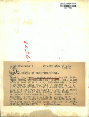 Mr. Wesley Randall, age 44, alias Frank Smith was arrested on February 19th on a bench warrant from Batavia New York, charging him with the kidnapping of Ehel Ahl, then 14 and now 22, his wife and the mother of four children. Randall said that they were married by a Justice of Peace in Kansas in July 1929, shortly after their "elopement" of "kidnapping" Te unusual aspect of the case is that of a man being charged with kidnapping the woman to whom he as been married for eight years and has borne his four children.