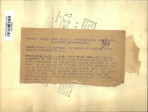 Washington DC Mrs Ruth Bryan Owen of Florida daughter of late William Jennings Bryan and recently selected as US Minister to Denmark is shown with Otto Wadsted the Danish Minister to US Mrs Owen called on Minister Wadsted and his wife at Danish Legation here The first woman minister from US stated her visit was just a friendly call and chat