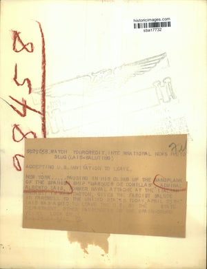 Pausing in his climb up the gangplank of the Spanish Ship Marques De Commillas Admiral Alberto Lais former Naval Attache at the Italian Embassy in Washington gives the Fascist salute in farewell to the Unites States, Lais was asked to leave the U.S. by the State Department other passengers on the Spain bound Vessel look on.