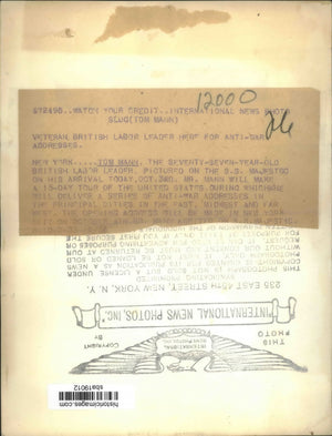 Veteran British Labor Leader Here For Anti-War Addresses. New York.....Tom Mann, the seventy-seven-year-old British Labor Leader, pictured on the S.S. Majestic on his arrival today, Oct. 3rd. Mr. Mann will make a 15-hour tour of the United States during which he will deliver a series of anti-war addresses in the principal cities in the East, Midwest and far West. The opening address will be made in New York City on October 4th. Mr. Mann arrived on S.S. Majestic.