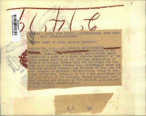 U.S. Housing Administrator, Nathan Straus (L), and the Director of the National Assoc of Housing, are shown inspecting a model of a model housing community at the 6th annual meeting of the National Assoc of Housing Officials. Straus told the officials the Federal Slum Clearance Program will eventually solve the American Housing Program and revealed he will ask the next session of Congress for additional funds to continue operations. Speaking on the first anniversary of the initiation of the program, Straus disclosed that only $76,000,000 remains of the original $800,000,000 Federal Housing appropriation.