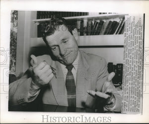 The Reverend Bob Richards Olympic pole vault champion, fondly eyes keys representing a new Mercury he was given on TV's "This Is Your Life" program last night. Dan Ferris, secretary-treasurer of the AAU, said in New York today that Richards, who wants to remain an amateur and compete in the next Olympics, probably will have to return the car in order to retain his amateur standing. Richards is pastor of the Church of the Brethren in nearby Long Beach, but Ferris said "it must be assumed" Richards received the award because of his prominence as an athlete and not because of his church work.