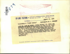 Bobby Warren, 13, likes the prospect of going to Washington to live in the event his dad's party wins the forthcoming elections, but only if he is permitted to take along his favorite mount. Bobby is enthusiastic about his riding and enjoys the trail through Sacramento Valley. Here he and Nina (universally called Honey Bear) rest during a trail ride.