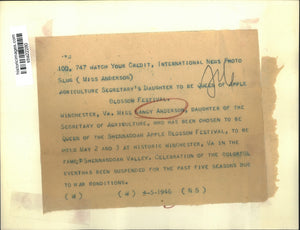 Winchester VA Miss Nancy Anderson daughter of the Secretary of Agriculture who has been chosen to be Queen of Shennadoah Apple Blossom Festival to be held May 2 and 3 at historic Winchester Va in the famed Shennadoah Valley. Ceelebration of the colorful events has been suspendeed for past 5 seasons due to war conditions
