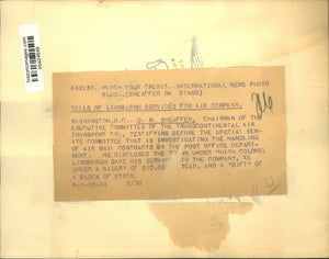 D.M. Sheaffer chairman of the executive committee of the Transcontinental Air Transport Co. Testifying before the Special Senate Committee that is investigating the handling of Air Mail Contracts by the Post Office Department. He disclosed the terms under which Colonel Lindbergh have his service to the Company as under salary of $10.000 and a Gift of a block of stock.
