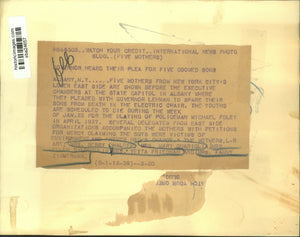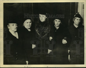 Five mothers from New York City's Lower East side are shown before the executive chambers at the State Capitol in Albany where they pleaded with Governor Lehman to spare their sons from death in the electric chair. The youths are scheduled to die during the week of January 22 for the slaying of policeman Michael Foley in April 1937. Several delegates from East side organizations accompanied the mothers with petitions for mercy claiming the boys were victims of environment and never had a chance. The mothers left to right are Mrs. Berry Chaleff, Mrs. Mary Guariglia, Mrs. Ellen O'Loughlin, Mrs. Yetta Friedman and Mrs. Fanny Zimmerman.