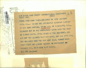 Alto Calif Amazed and apparently slghtly baffled at his good fortune Frank Lee of Sausalito Cal clambers out of his overturned sedan with the help of Harold Smith Still dazed by the accident Lee has not yet learned that his wife who was with him was inhured when the car went wild turned over 4 times and landed against an embankment on highway 101 near here last night