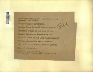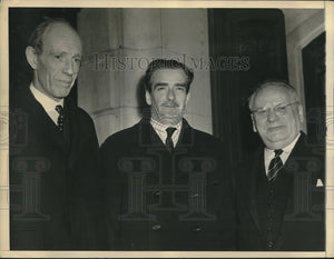 Anthony Eden (C) British Foreign Minister, paused at the door of the Russian Embassy in D.C. after he and Lord Halifax (L), had a luncheon conference with Maxim Litvinoff (R).