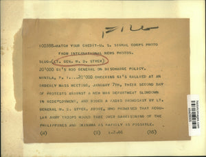 20,000 cheering GIs rallied at an orderly mass meeting January 7th, their second day of protests against a War Department slow down in redeployment and booed a radio broadcast by Lt Gen WD Styer who promised that regular Army troops would take over garrisoning of the Philippines and Okinawa as rapidly as possible.