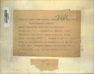 Constantine Oumansky, first Ambassador from Soviet Russia to Mexico, shakes hands with President Manuel A Camacho of Mexico after he had presented his credentials at the National Palace. Envoy Oumansky formerly represented Russia in Washington DC, but was replaced by Maxim Litvinov.