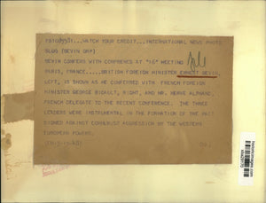 Paris France British foreign minister Ernest Bevin at left is shown as he conferred with French foreign minister George Bidault and Mr Herve Alphand, French delegate to the recent conference. The 3 leaders were instrumental in the formation of the pact signed against Communist aggression by Western European powers.