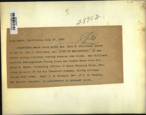 Posthumous award being given Mrs Ruth W Gilliland, widow f 1st Lt Don J Gilliland who lived in San Antonio. He was killed during volunteer bombing mission over Kiska. Mrs Gilliland got Distinguished Flying Cross and Purple Heart from Col Ralph E Spake, commanding officer Ferrying Division of Air Transport m, during military review today. Capt JM Simpson, Ret of US Cavalry, San Antonio resident is grandfather of deceased pilot.