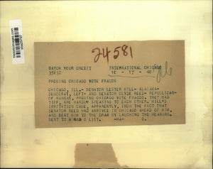 Senator Lester Hill (R) and Senator Clyde Reed probe Chicago vote frauds. They had a tiff, are hardly speaking to each other. Hill's irritation came from the fact that Sen Reed had arrived in Chicago ahead of him, and beat him to the draw by launching the hearing.