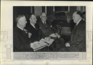 Swift & Company Representatives LTR: J.E. Wilson; W.N. Stroke and K.M. Clark, talk with Edwin Hintes Chairman of President's meat fact-finding board during meeting at Labor Department as solution of pack house workers' strike is sought.