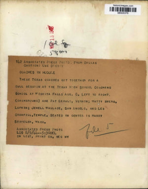 Texas Coaches got together for a full session at the Texas High School at Wichita Falls. Pat Gerald, Vernon, Watty Myers, Jewell Wallace, and Les Cranfill