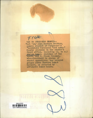 "Let 'em," Says Barbara Britton, comely starlet of Paramount's"Lousiana Purchase" "Eat Cake." nearly everyone if the studio's front office including (L. to R.)Adolph Zukor,Chairman of the board, and Y. Frank Freeman, Vice-President in Charge of studio operations, has enjoyed ginger cakes Barbara bakes herself, as attested by affidavit Zukor holds.