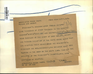 President's grandchildren frolic in snow like thousands of other children in the Capital Eleanor Sistie Ball and brother Curtis Buzzie Ball were thrilled at sight of snow Dec 27 Hurrying thru breakfast at teh White House where they are visiting their grandfather and grandmother President & Mrs Roosevelt The children both were playing in snow on South lawn They are the children of the President's daughter Mrs John Boettiger of Seattle