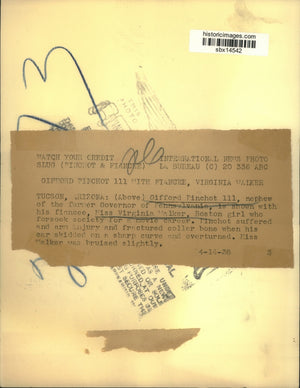 Gifford Pinchot, III, nephew of the former Governor of Pennsylvania, is shown with his fiancee, Ms Virginia Walker, Boston girl who forsook society for a movie career. Pinchot suffered an arm injury and fractured collar bone when his car skidded on a sharp curve and overturned. Ms Walker was bruised only slightly.