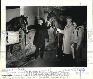 Father Slattery visits the stables with trainer Tom Miles and his daughter, Jeanne. Reverend Kenneth Slattery. Belmont Race Track. Father Kenneth Slattery petting a gelding named "Just Another Summer" winner of the 1985 $117,000 New York Derby. Trainer Tom Miles and his daughter Jeanne Miles.