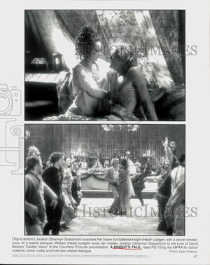 (Top to bottom) Jocelyn (Shannyn Sossamon) surprises her brave but battered knight (Heath Ledger) with a secret rendezvous. At a festive banquet, William (Heath Ledger) woos fair maiden Jocelyn (Shannyn Sossamon) to the tune of David Bowie's "Golden Years" in the Columbia Pictures presentation, "A Knight's Tale," rated PG-13 by the MPAA for action violence, some nudity and brief sex-related dialogue.