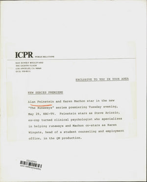 Alan Feinstein and Karen Machon star in the new "The Runaways" series premiering May 29, on NBC Television. Feinstein stars as Steve Arizzio, ex-cop turned clinical psychologist who specializes in helping runaways and Machon co-stars as Karen Wingate, head of a student counseling and employment office, in the QM production.