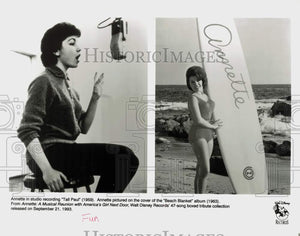Annette Funicello in studio recording "Tall Paul" (1959). Annette pictured on the cover of the "Beach Blanket" album (1963). From Annette: A Musical Reunion with America's Girl Next Door, Walt Disney Records' 47-song boxed tribute collection released on September 21, 1993.