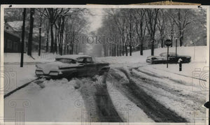 1959 Press Photo Cars try to maneuver snow-covered Park & Danforth streets
