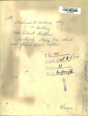 Albany, New York - Clarence B. Wilcox, attorney, and Mrs. Robert Ristau, secretary, look over strongbox which was forced opened & rifled