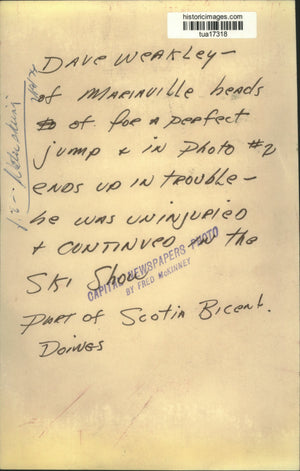 Dave Weakley of Mariaville, New York heads of for a perfect jump & in photo #2 ends up in trouble - he was uninjured & continued the ski show, part of Scotin Bicentennial doings