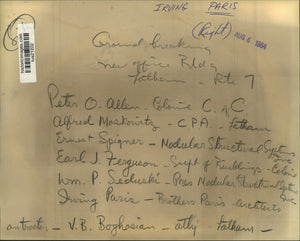 Groundbreaking ceremony for office building on Route 7 in Latham, New York - Peter O. Allen, Colonie Chamber of Commerce; Alfred Moskowitz, CPA, Latham; Ernest Spigner, Modular Structural Systems Inc; Earl J. Ferguson, Superintendent of Buildings, Colonie; William P. Seduski, President, Modular Structural Systems Inc.; Irving Paris, Brothers Paris, architects; V. B. Boghosian, attorney, Latham, on tractor