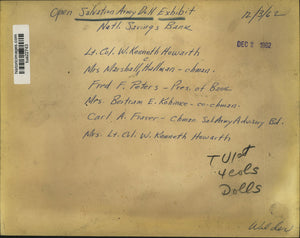 People look at open Salvation Army Doll Exhibit at National Savings Bank. Left to right: Lieutenant Colonel W Kenneth Howarth, Mrs Marshall C Hallman, chairman; Fred F Peters, President of Bank; Mrs Bertram E Kohinke, co-chairman; Carl A Fraser, Chairman Salvation Army Advisory Board, and Mrs Lieutenant Colonel W Kenneth Howarth.