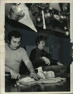 1973 Press Photo Mr and Mrs Sol Seras chop food in industrial kitchen