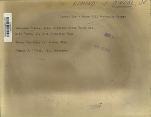Edmund J O'Neal, Jr, (right), Chairman of the New York State Youth Division, meets with students on career day at the Arbor Hill Community Center. With him, left to right: Lawrence Pierce, executive directory and students Alan Clowe, 17, Schuyler High School;; and Karen Chandler, 16, Albany High School, New York