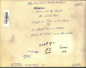 F Donald Lewis (center), chairman of Albany New York Lions Club, stuffs envelopes for Association of the Blind, 301 Washington Avenue. Helping him are Joseph W Pike, Assistant Chairman (left) and Harvey M Lifset, committee member.