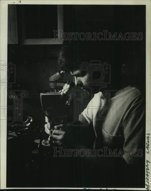 1975 Press Photo Don Malloy looks through microscope to study black flies.