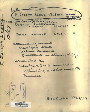 Attending recent New York State Urban Renewal Institute in Utica, New York conducted by New York State Division of Housing and Community Renewal - F. Joseph Leone, Albany Urban Renewal Director; James William Gaynor, Commisioners of New York State Division of Housing & Community Renewal; Donald T. Veitch, Saratoga Urban Renewal Director; Dana Roecher, Utica Urban Renewal Director - renewal parlay