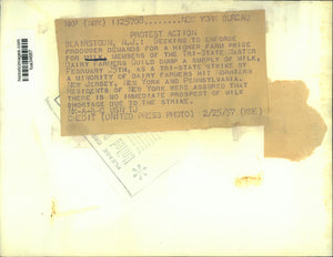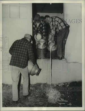 Blairstown, NJ - Seeking to enforce demands for a higher farm price for milk, members of the Tri-State Master Dairy Farmers Guild dump a supply of mile, February 25th, as a tri-state strike by a minority of dairy farmers hit Northern New Jersey, New York and Pennsylvania. Resident of New York were assured that there is no immediate prospect of milk shortage due to the strike.