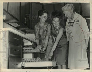 1964 Press Photo Ladies inspect dishwasher in model kitchen in New York
