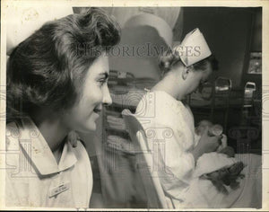 New York - Student nurse Carmen Rickers of Albany looks into nursery where Mrs. Peter Glass, child care technician, holds baby