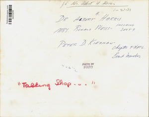 Dr. Albert H. Harris - Dr. Albert H. Harris; Mrs. Ronald Weiss - incoming secretary; Peter D. Kiernan - chapter and national board member. "Talking shop..."